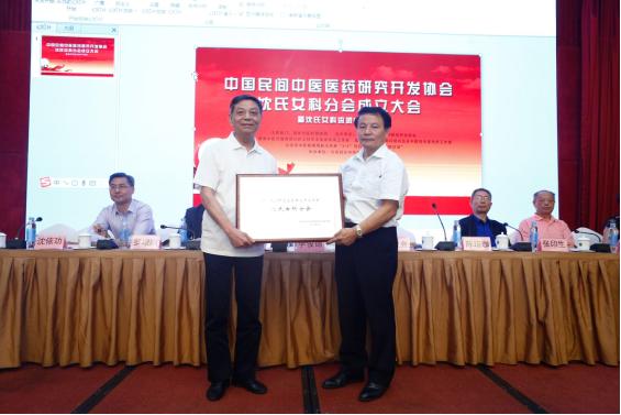 中国民间中医医药研究开发协会陈珞珈会长向沈氏女科分会沈依功会长颁发沈氏女科分会牌匾